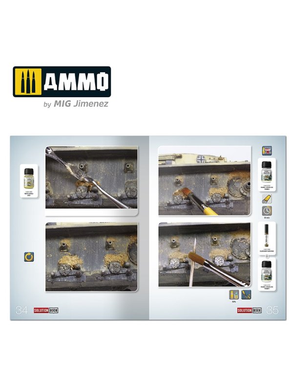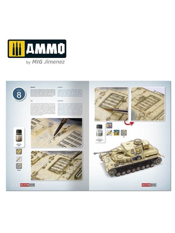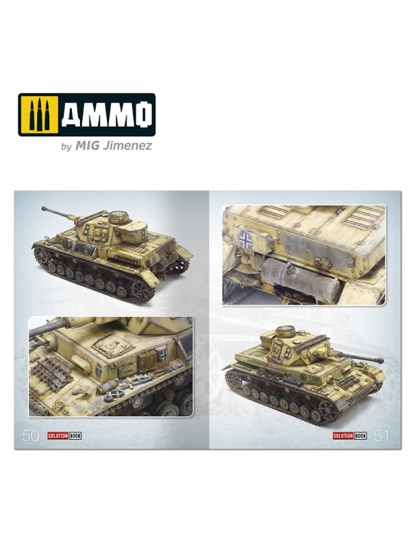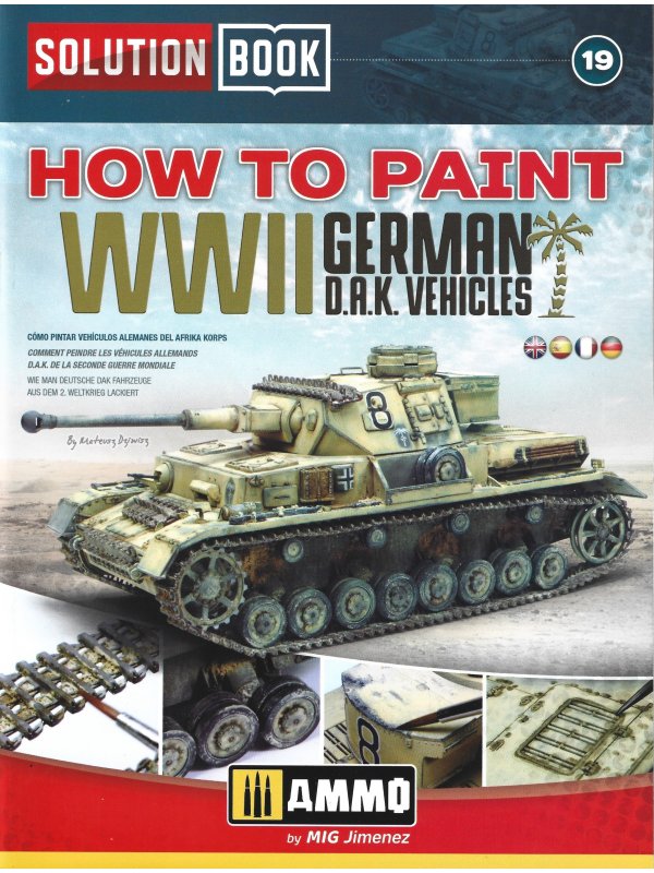 SOLUTION BOOK - How to Paint WWII German D.A.K .Vehicles. This complete 54 page guide with step-by-step tutorials in four languages (English, Spanish, French, and German) explains how to paint and weather Pz.Kpfw. IV Ausg F2 as used during the Africa campaign. Now you can paint and weather DAK vehicles from the initial battles through to the end of campaign in Tunisia.
