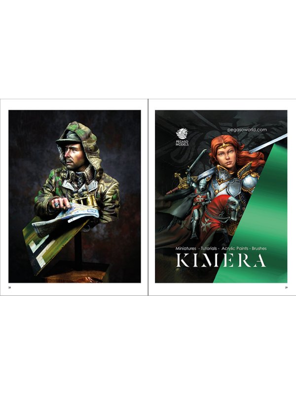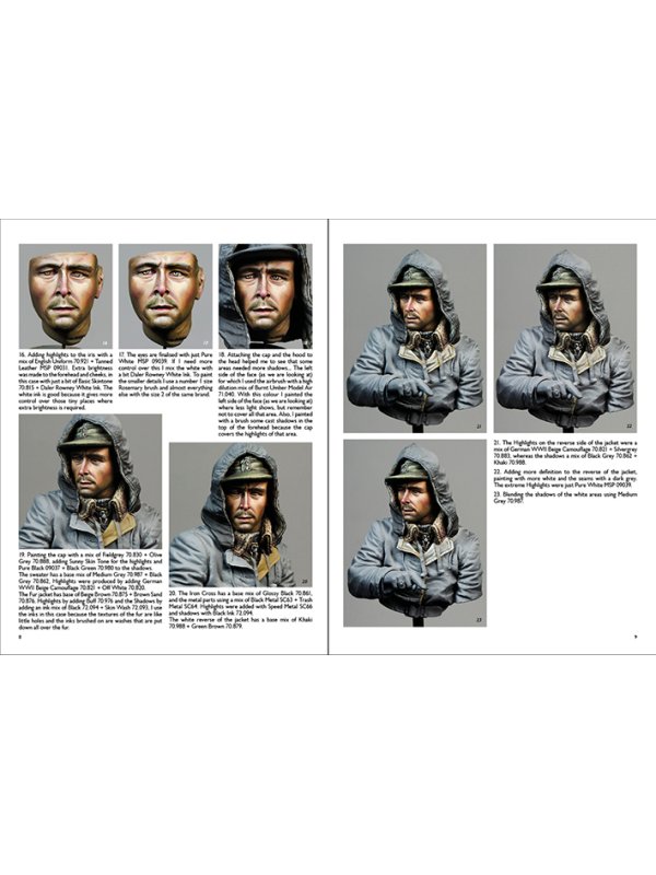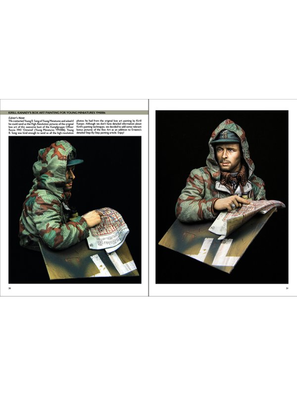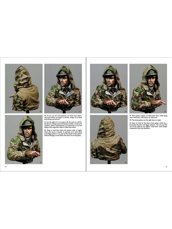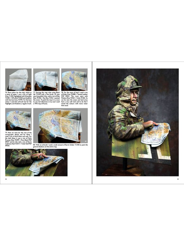 The artist presents a Painting Guide with 80 step-by-step photographs in exquisite detail with explanatory captions, as part of an overall total of 90 illustrations. Ernesto reveals all the secrets on how he painted the face (18 photos), the hand (7 photos), the cap and sweater (7 photos), the Splinter camouflage pattern (35 photos), binoculars and Sd.Kfz. plaque (9 photos), the map (5 photos) to achieve a realistic result. The artist used a combination of acrylic paints and acrylic inks. See how he managed to represent realistic flesh tones, the Splinter camouflage pattern, fabric, binoculars, map and much more…